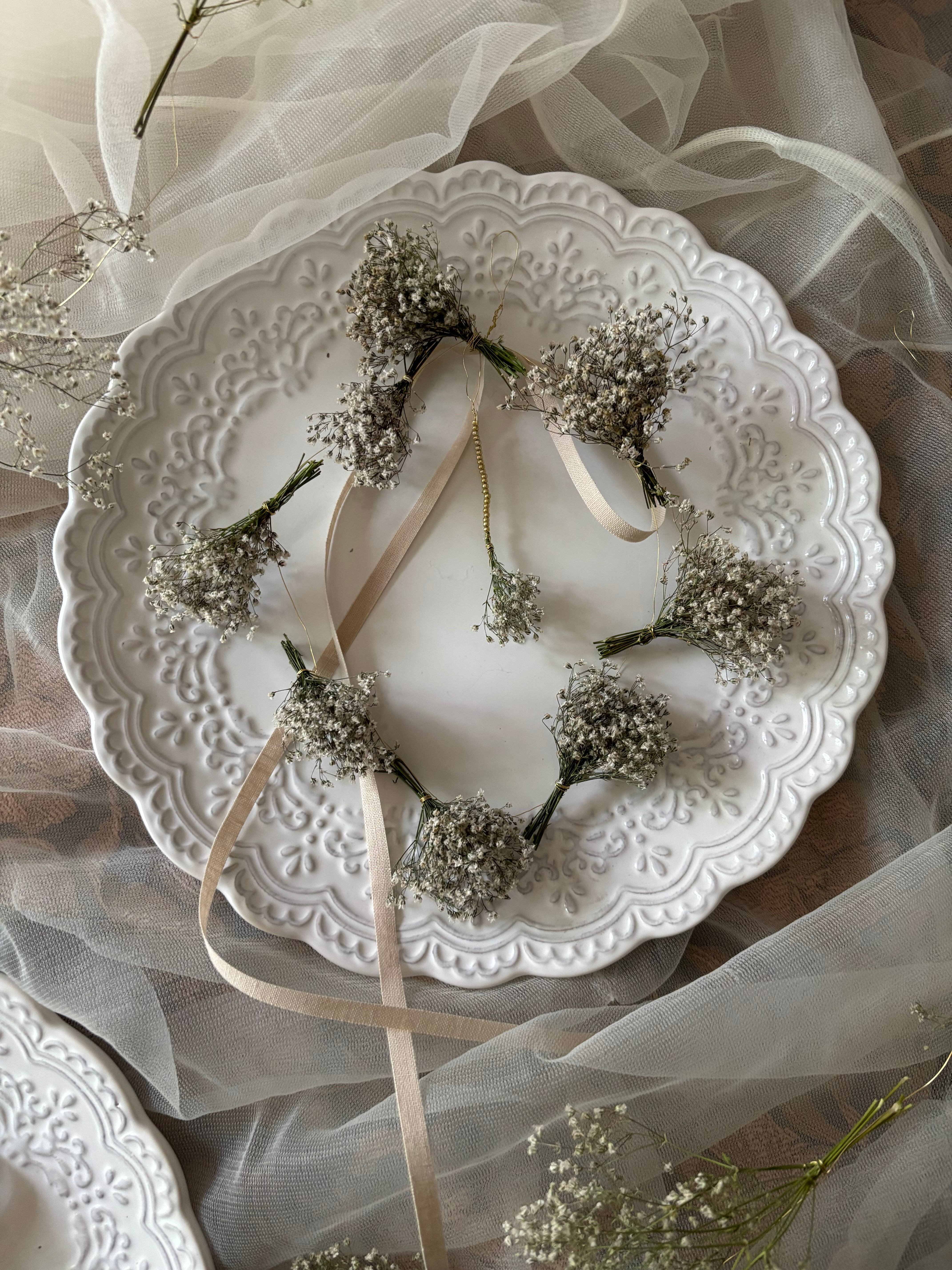 宿根かすみ草をミニ束にしたものをガーランドにしてからリースにしました。