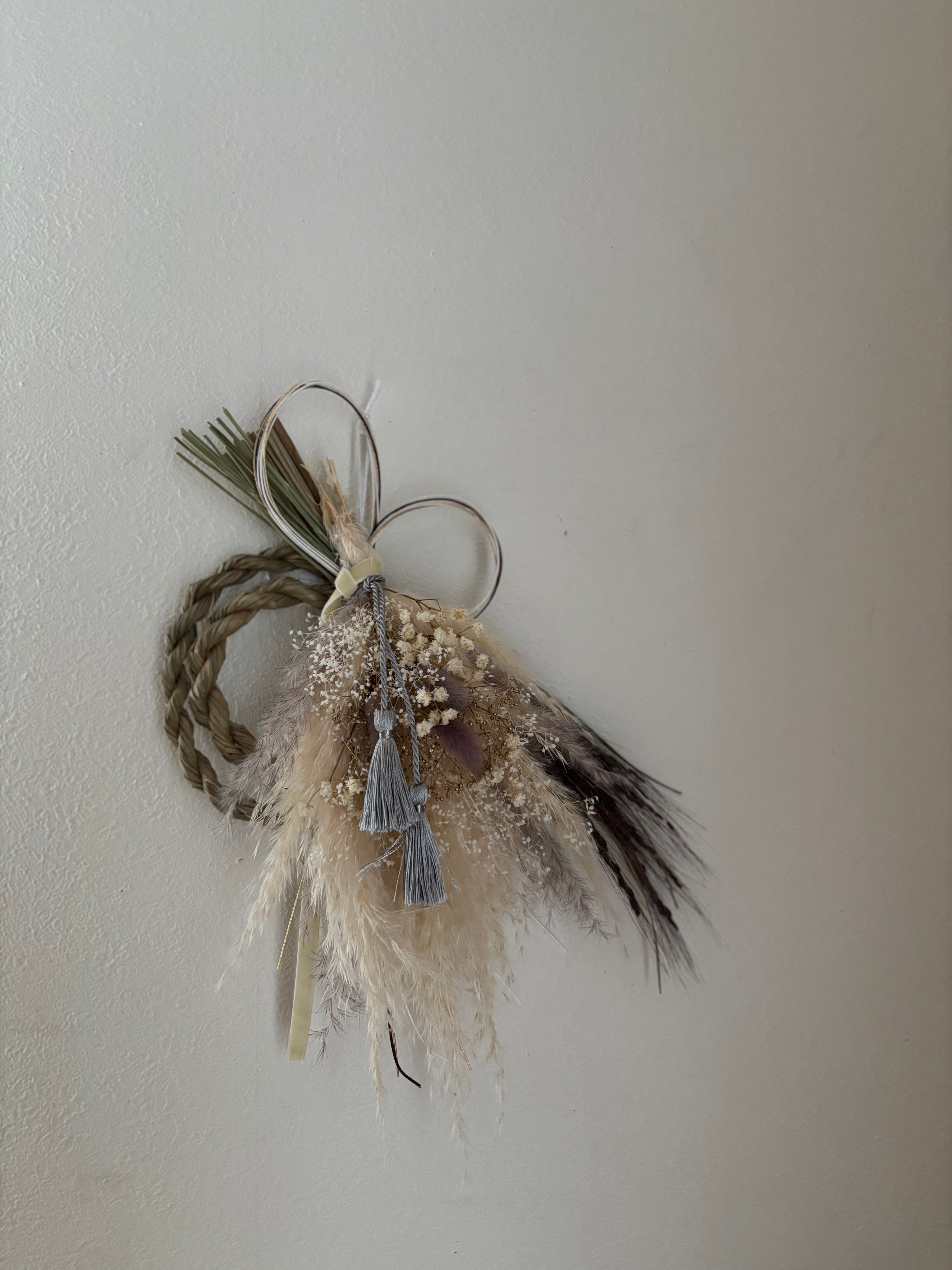 淡色のドライフラワーとプリザーブドフラワーを合わせた、cocosanaオリジナルの2wayタイプのしめ縄です。