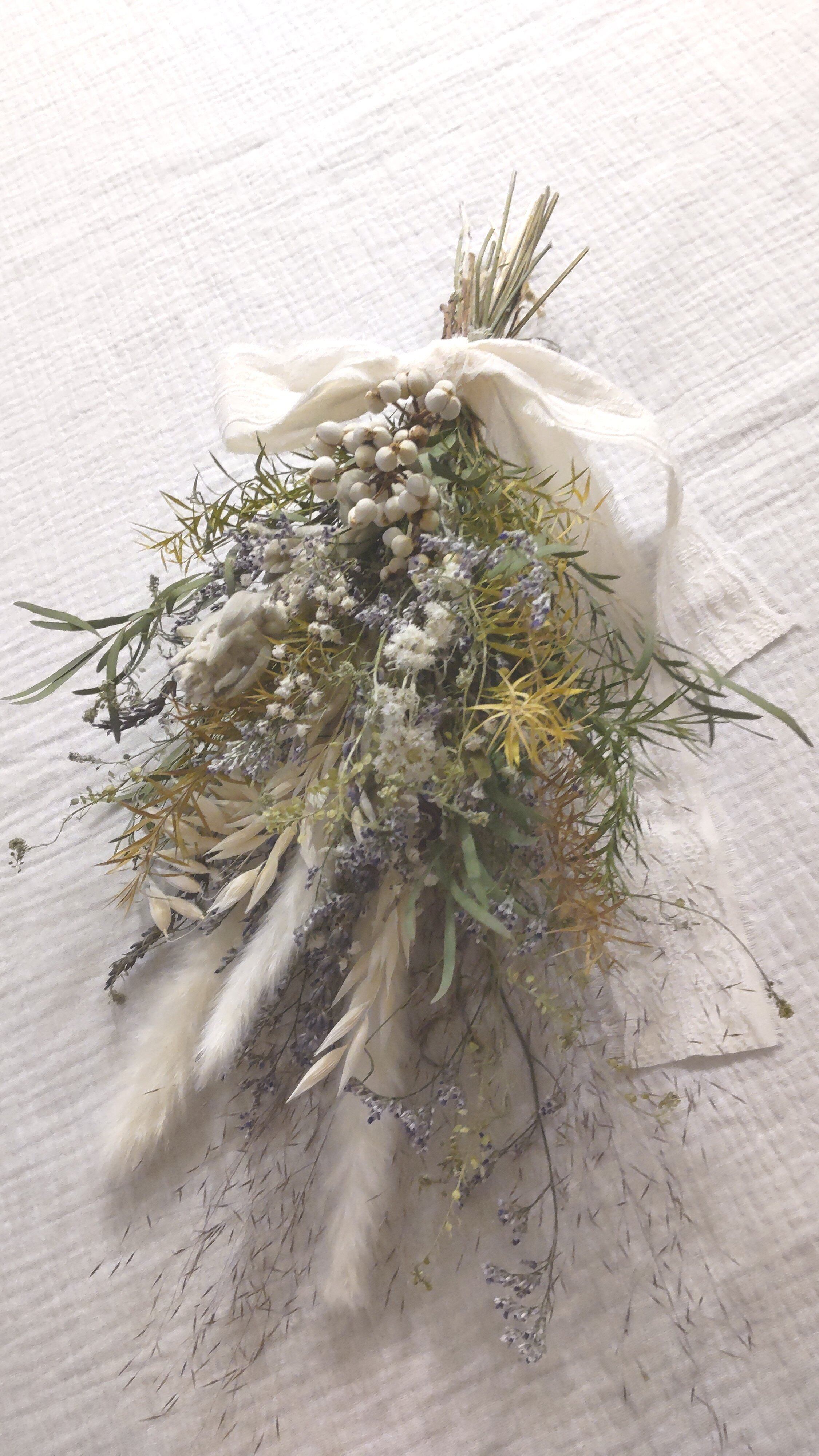 ティーツリーにパンパスグラスやラムズイヤー、ナンキンハゼをポイントに草花を束ねたような優しい雰囲気に‥‥✴°·