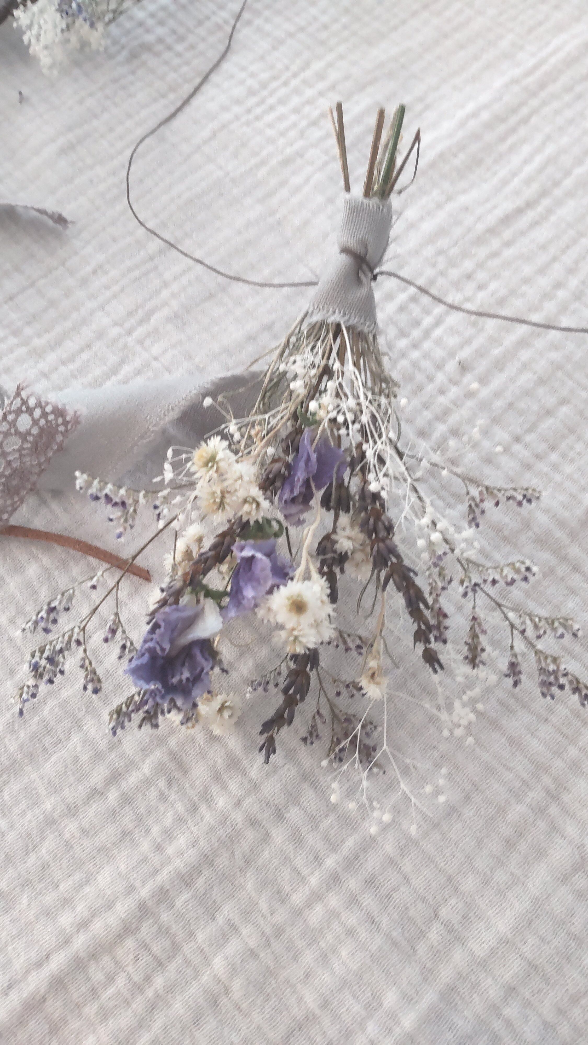 ホワイト、ブルー、パープルの小さな花束のガーランドにしてみました‥‥✳°·