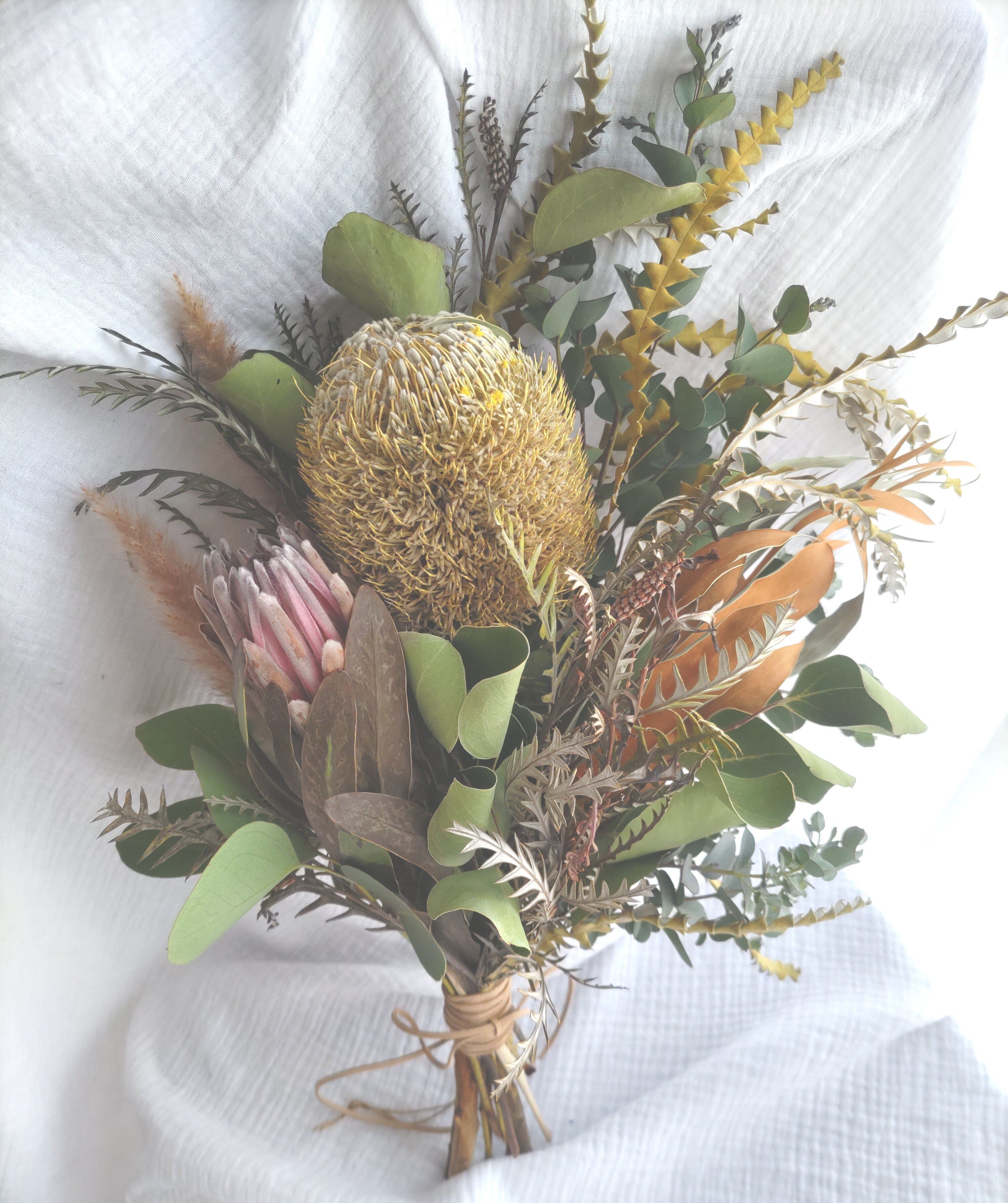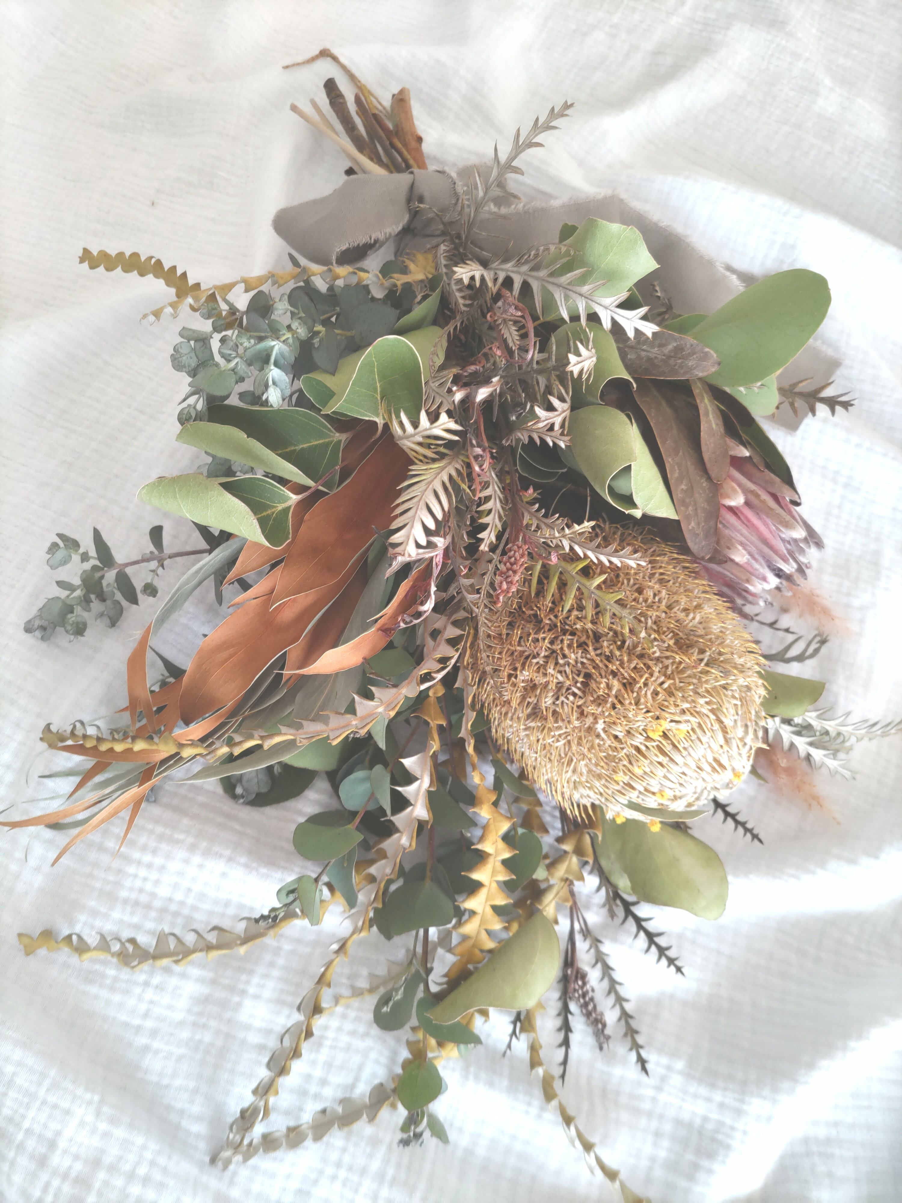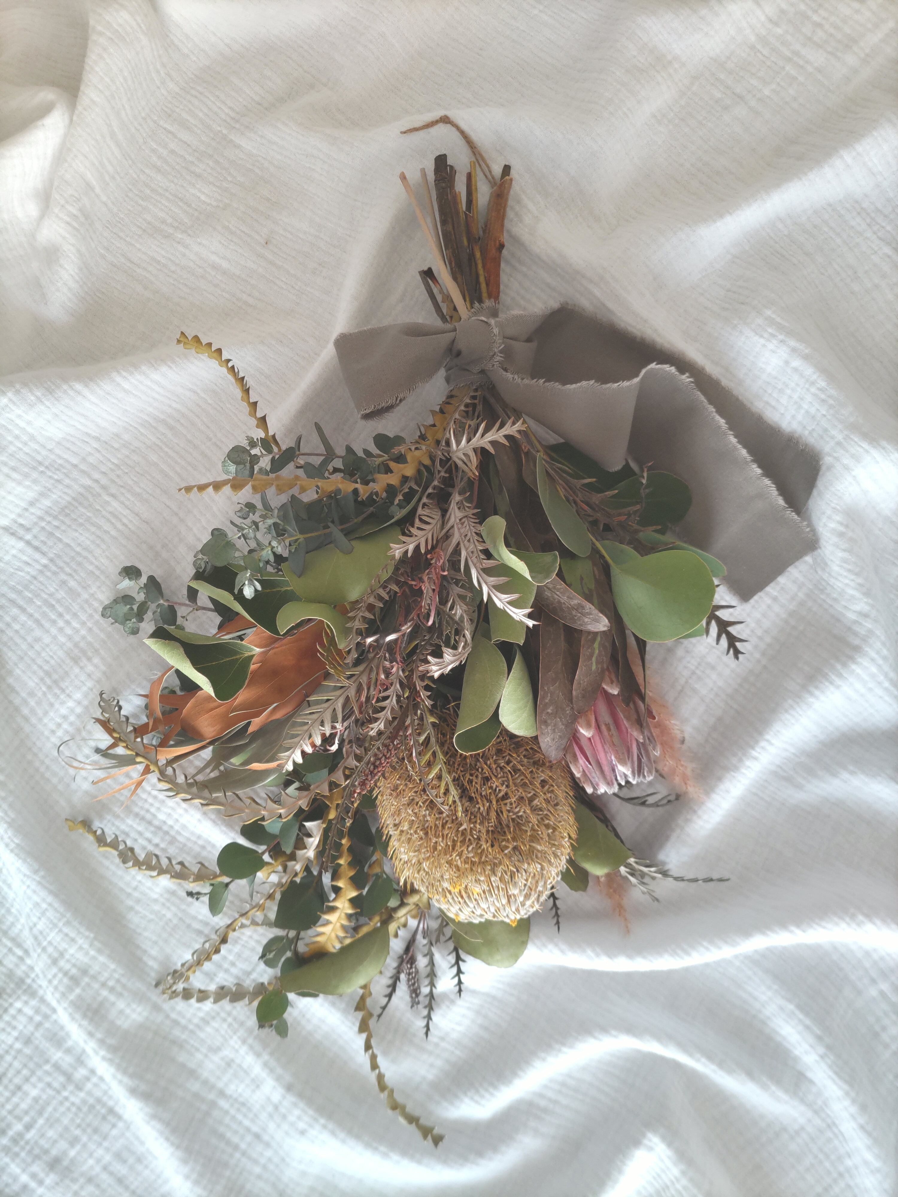 ネイティブフラワーのバンクシアとプロテア グレビレアゴールド グレビレアアイバンホーを束ねました‥‥✶°·