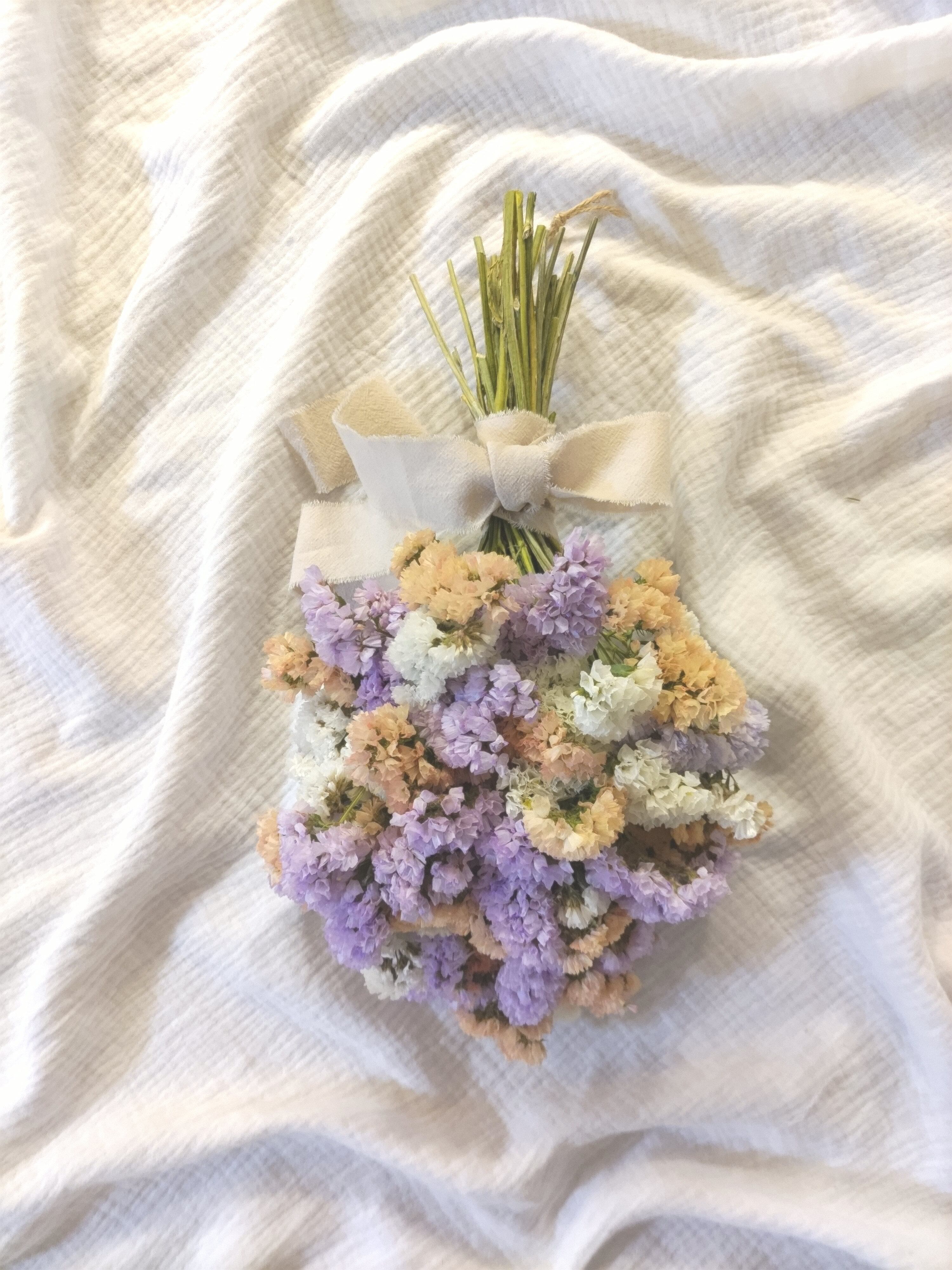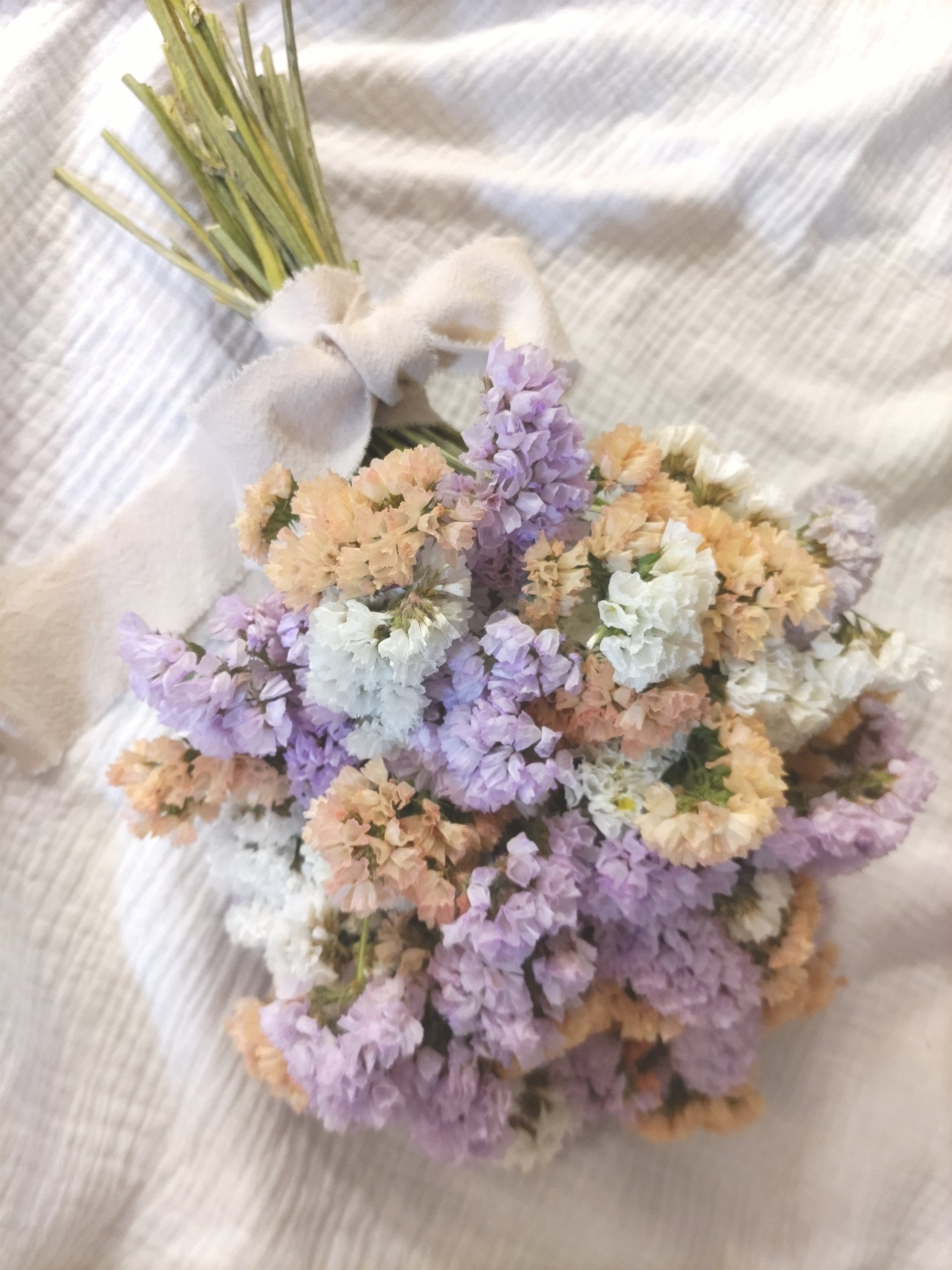 淡色のニュアンスカラーのスターチスをモコモコギュッと束ねたブーケにもなるスワッグです(人*´∀`)。*゚+