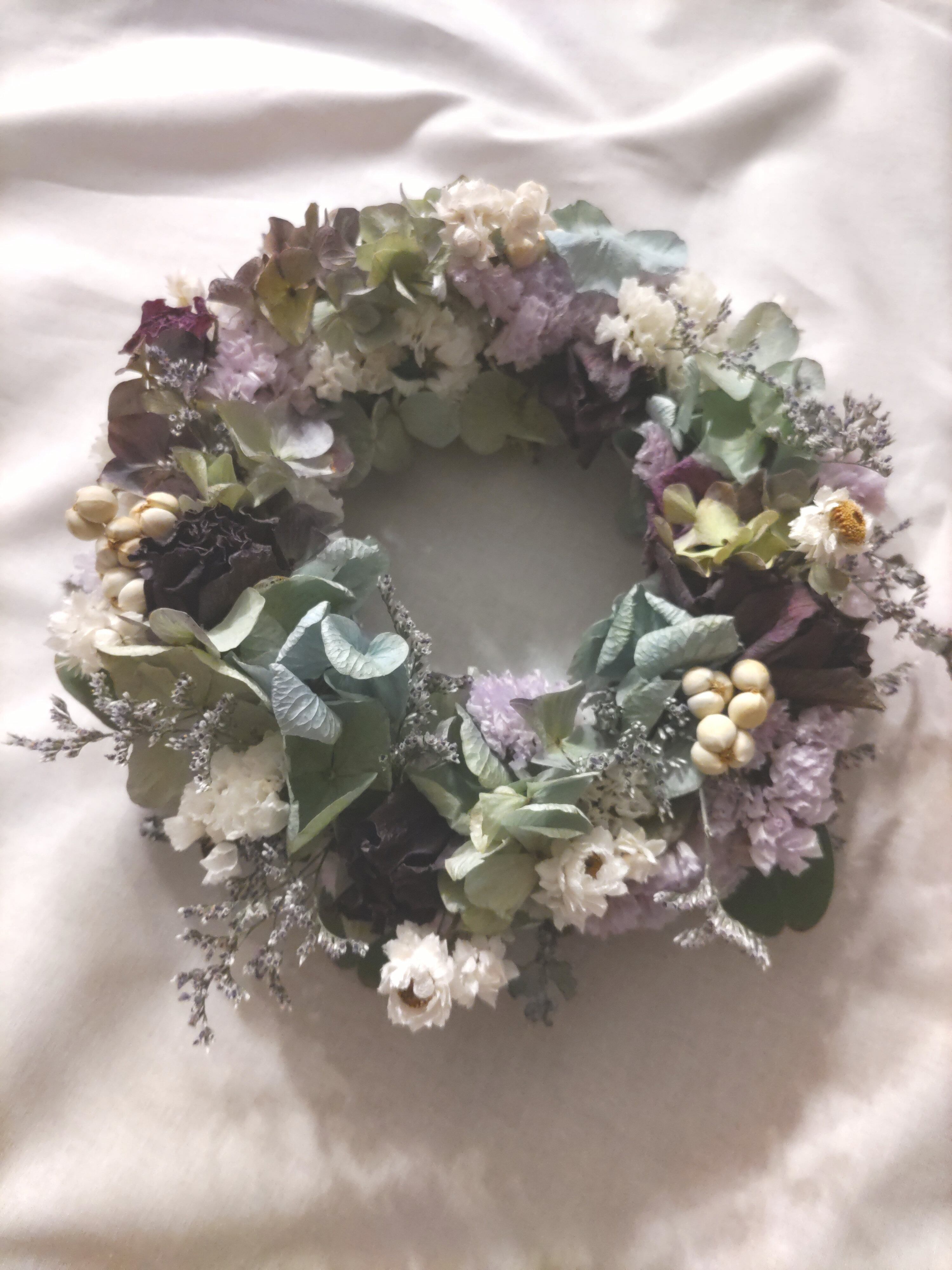 ブルー×パープルで落ち着いたリースにしました、クリスマスローズや秋色紫陽花を入れて(*˘︶˘*).。*