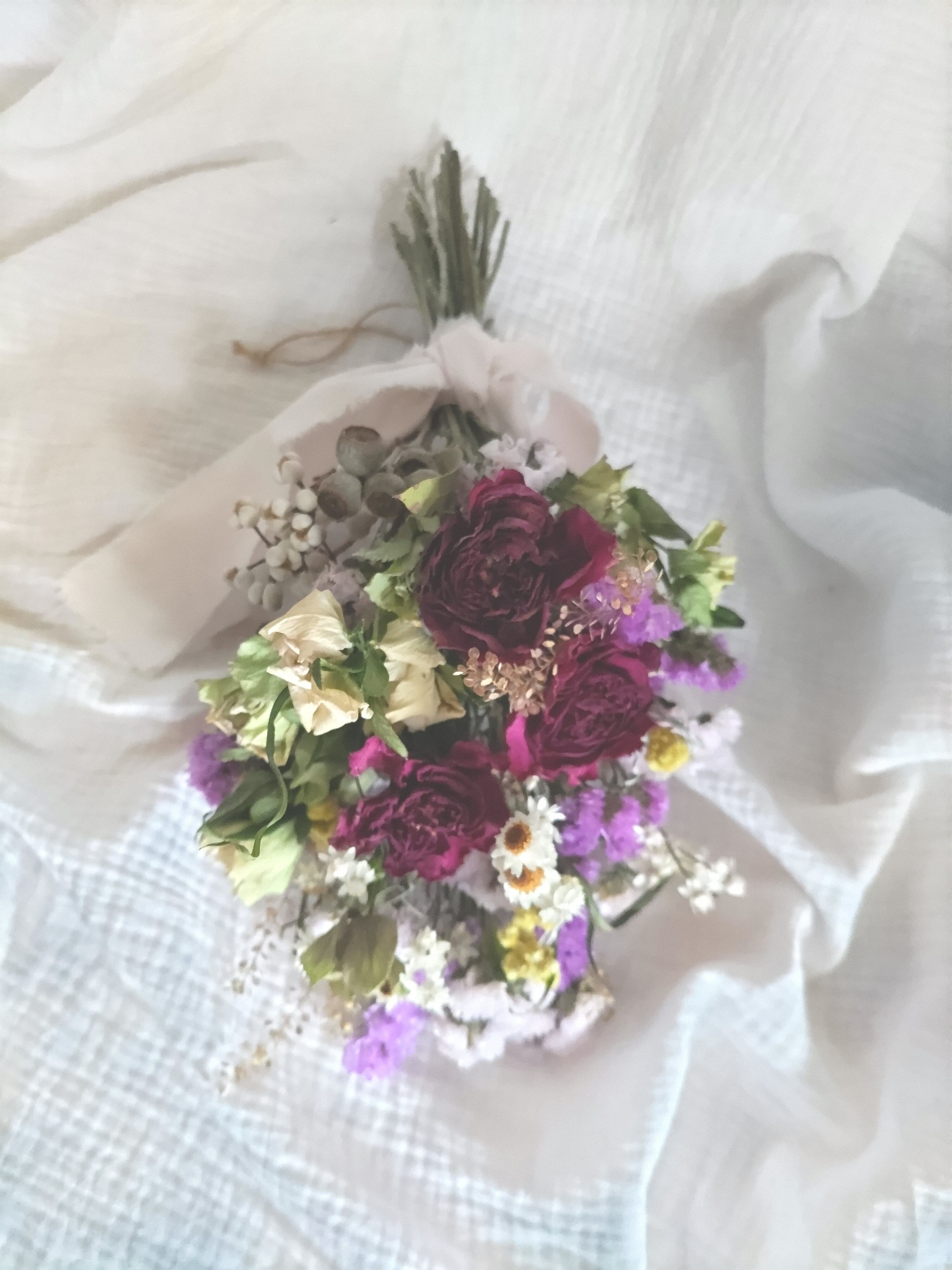 イブピアッチェにクリスマスローズや草花、ユーカリの実カップベリーなども合わせて束ねました。