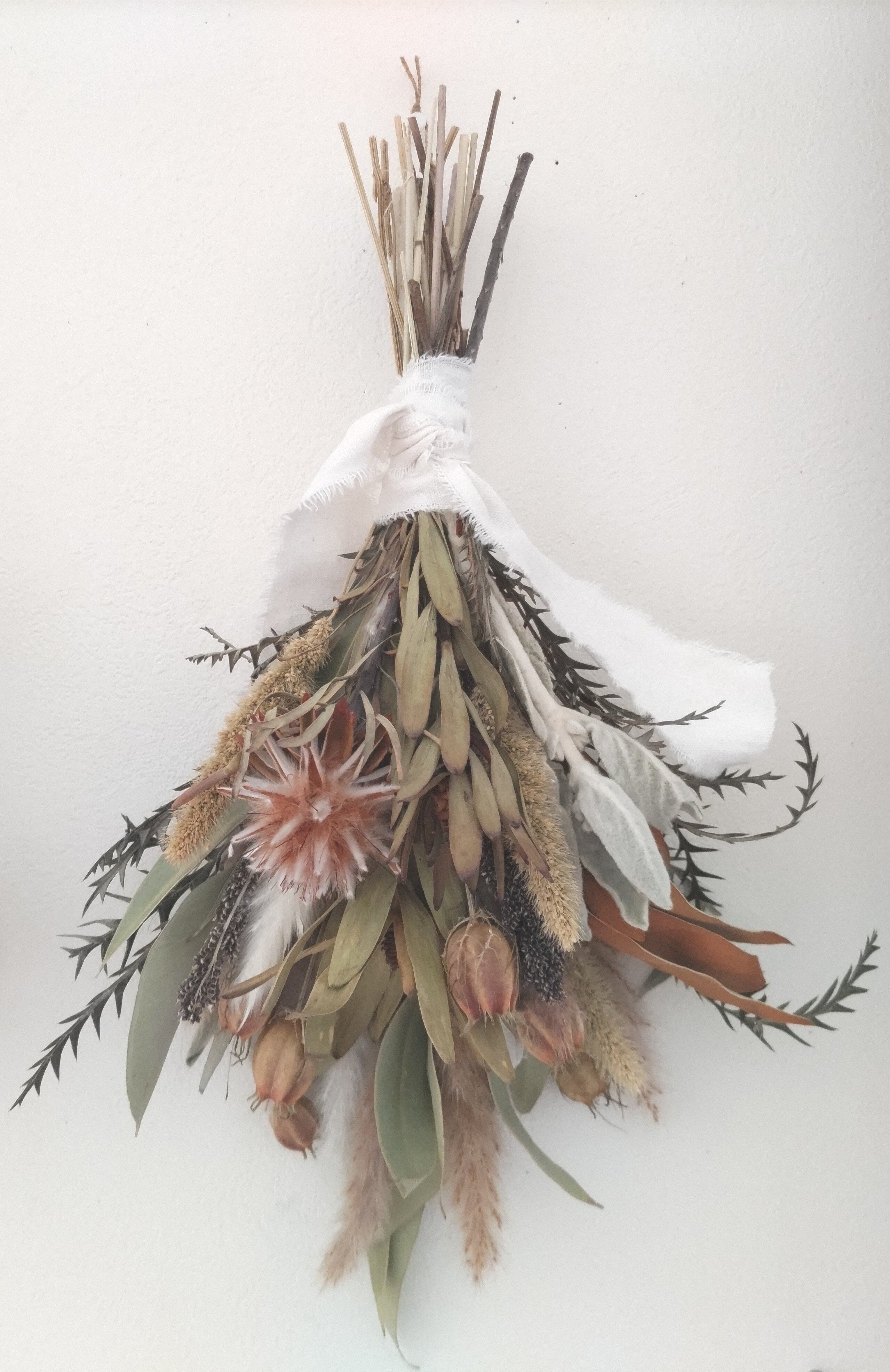 ネィティブフラワーにパンパスグラスやグレビレアアイバンホーやニゲラを合わせて束ねました( ◜‿◝ )