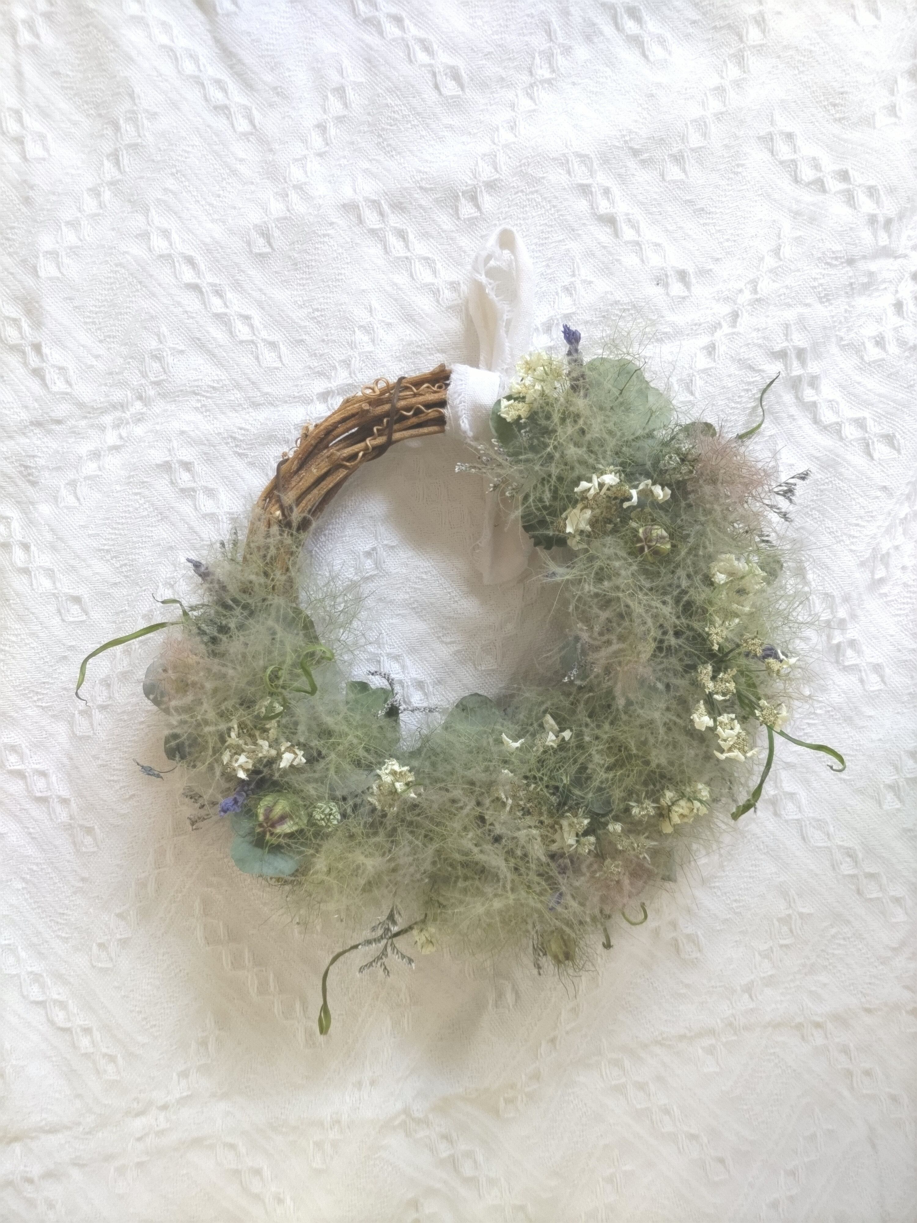 ライトグリーンのスモークツリーにレースフラワーや優しい色味を合わせたナチュラルドライリースです( ◜‿◝ )