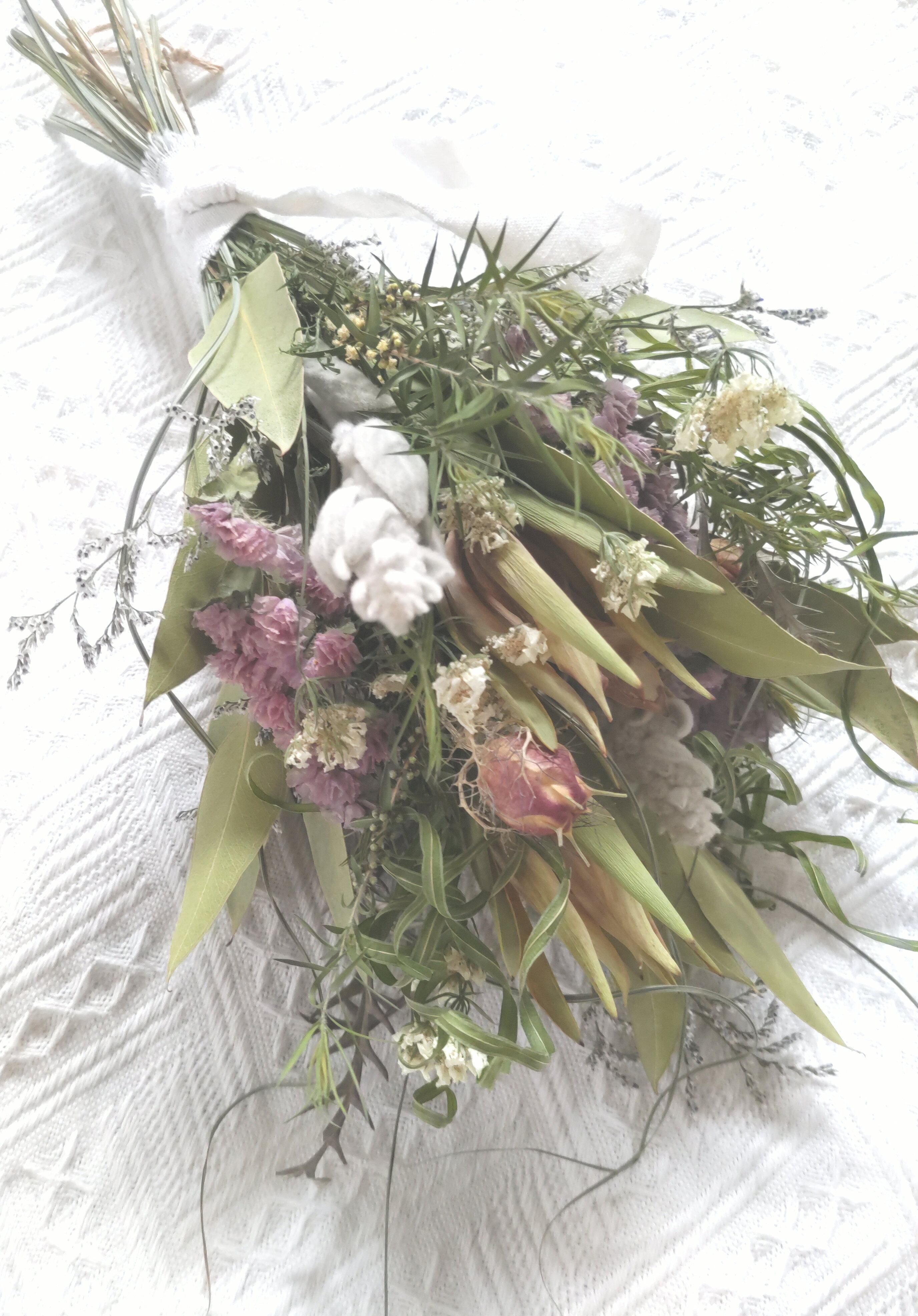草花にくすみパープルのスターチスを合わせて、ナチュラルなスワッグに仕上げました。
