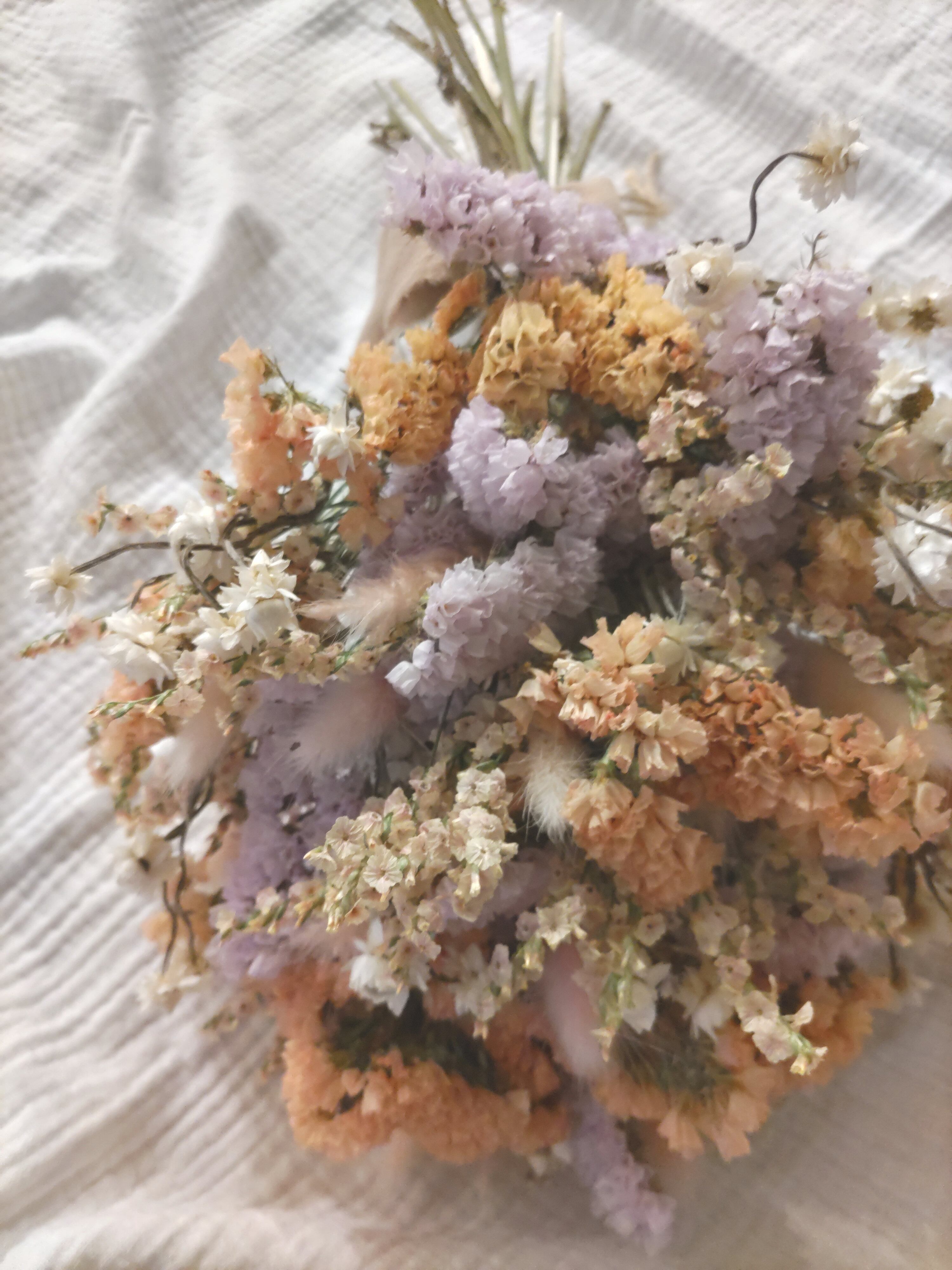 ニュアンスカラーのスターチスにアプリコットピンクのパンパスグラスをふわふわ合わせて(人*´∀`)。*゚+