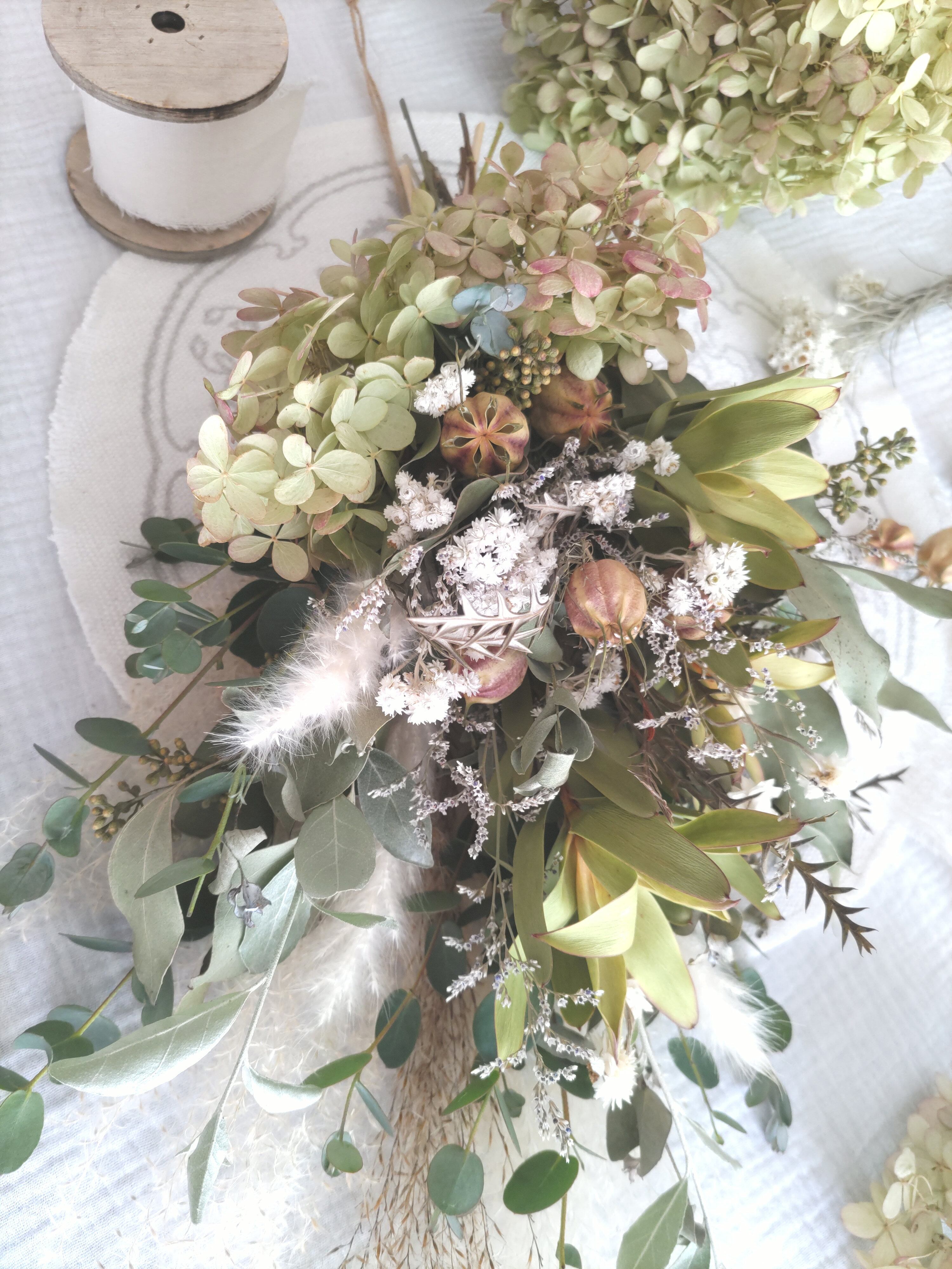ユーカリポポラスベリーに、ユーカリグニー、ロシアンオリーブ、リューカデンドロンにパンパスグラスやすすき、手元にミナズキを合わせて束ねました( ꈍᴗꈍ)