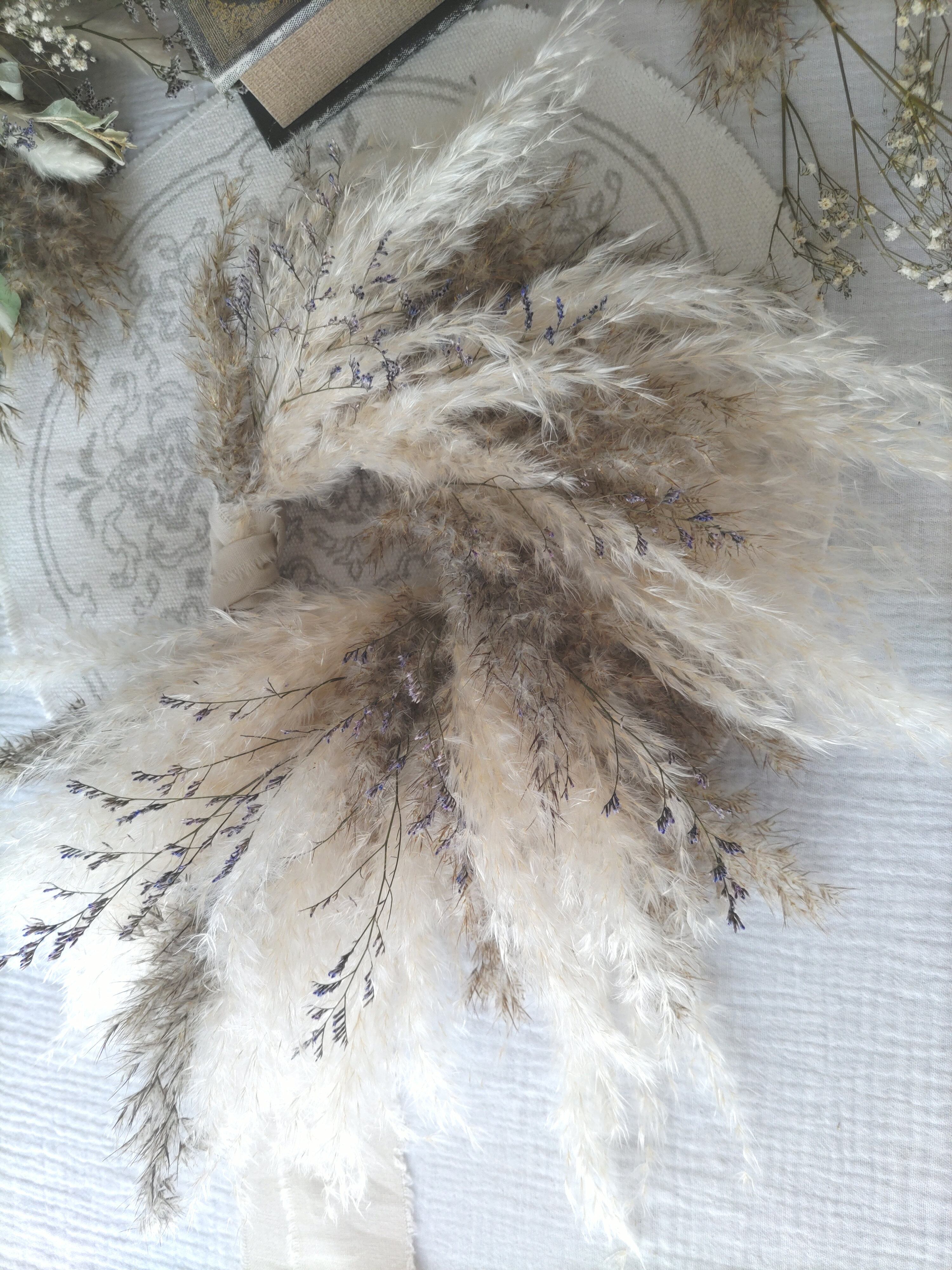 ふわふわのパンパスグラスにふわふわのヨシを合わせて、ホワイト×ブラウンの落ち着いたリースにしました。ブルーファンタジアも添えて…
