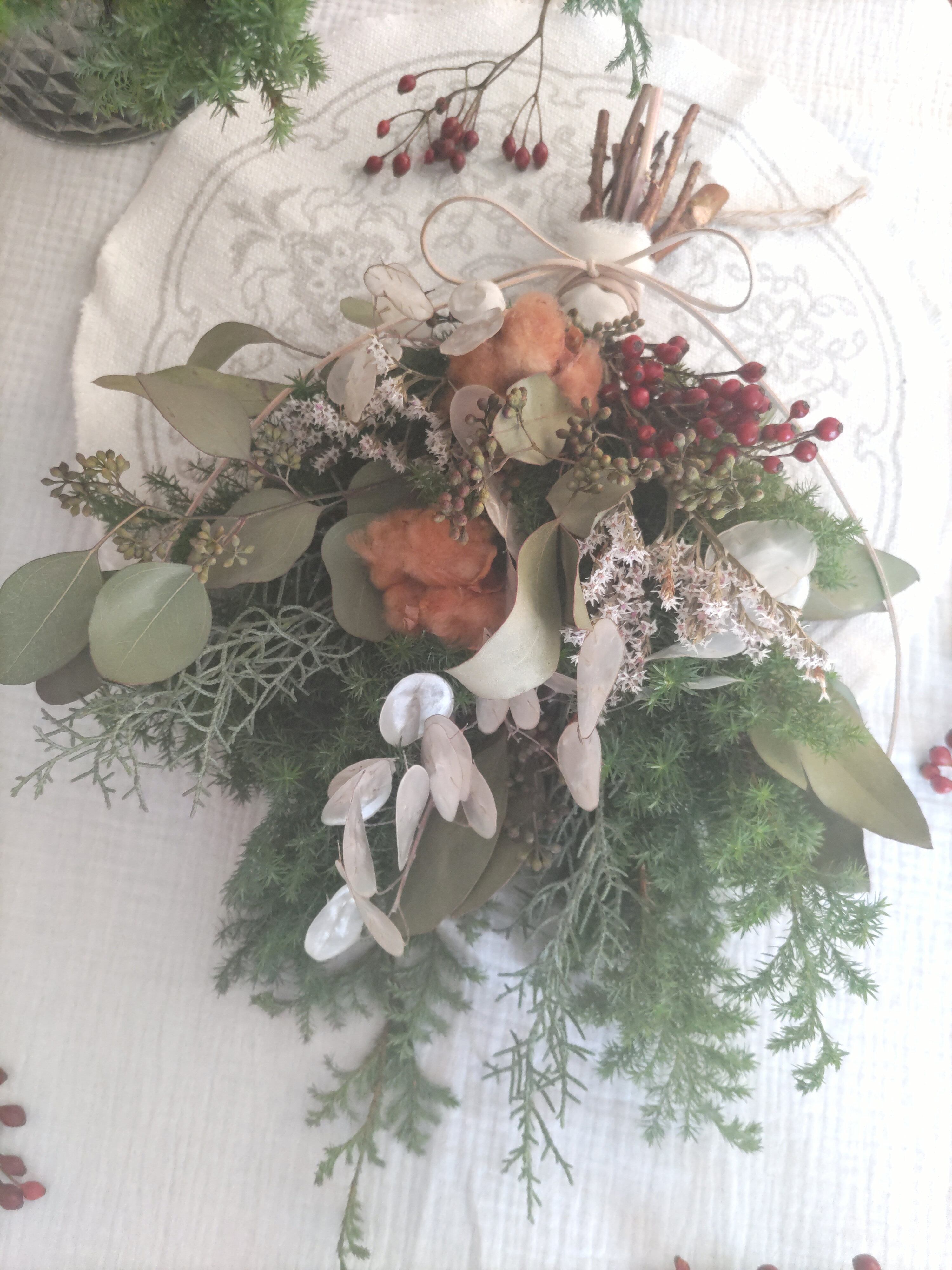 ヒムロ杉やブルーアイスにユーカリポポラスベリーもたっぷり合わせて、赤い実にルナリア、ブラウンのコットンフラワーを添えてクリスマスのドライフラワースワッグにしました( ꈍᴗꈍ)