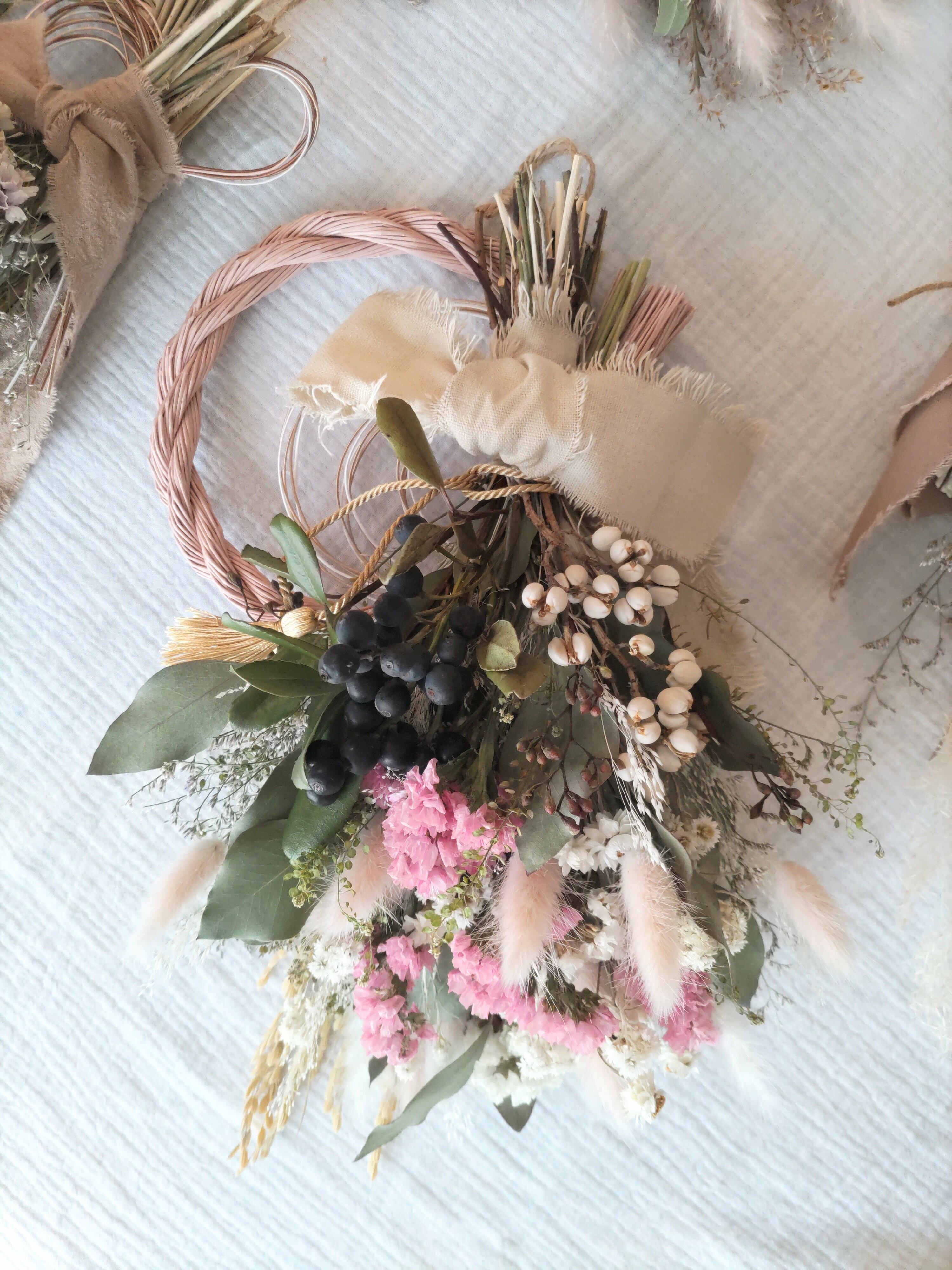 ピンクのしめ縄にナチュラルなスワッグを合わせたしめ縄リース&スワッグです。
