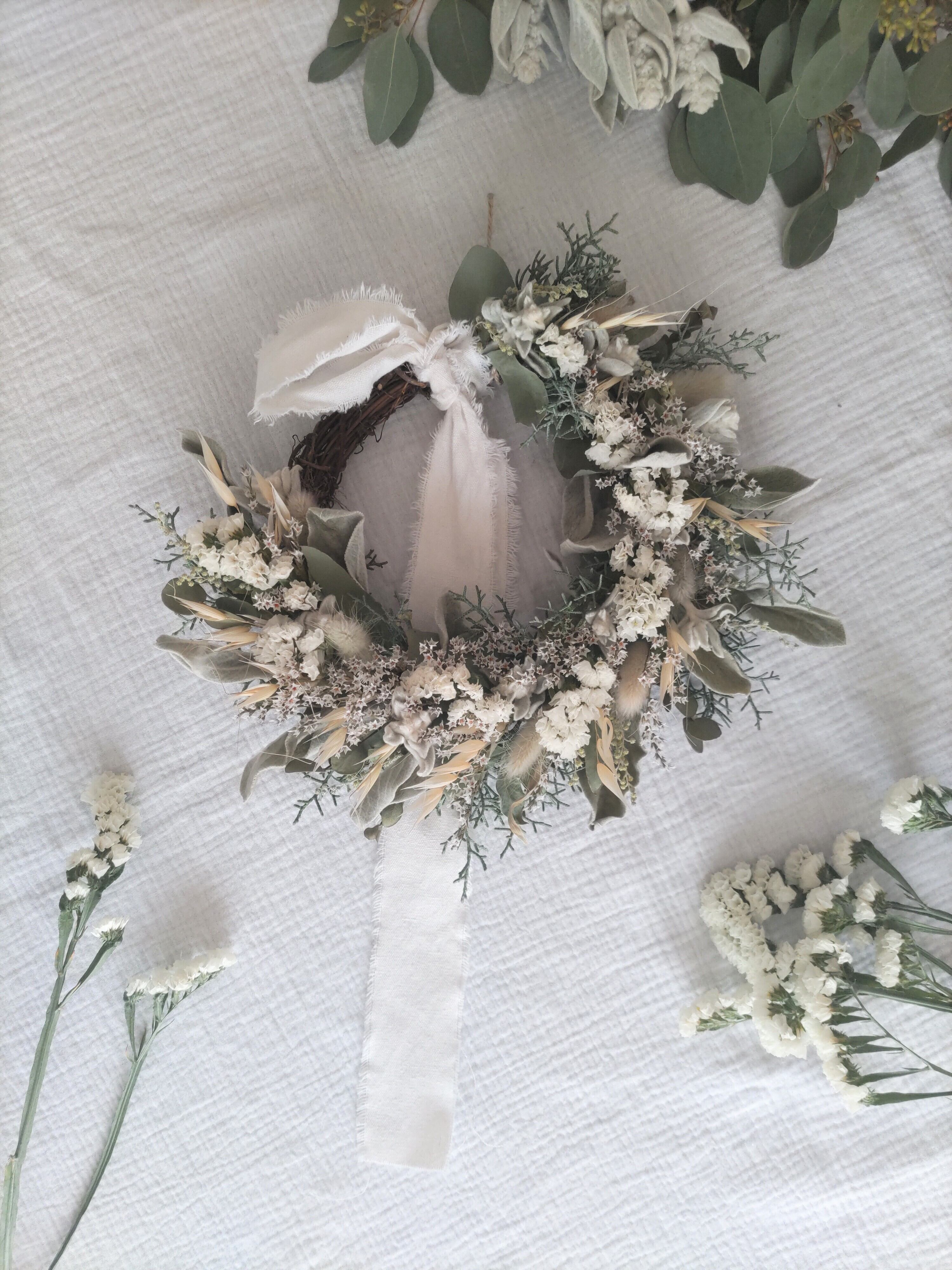 ほわほわのラムズイヤーやユーカリでナチュラルなドライフラワーリースにしました( ꈍᴗꈍ)
