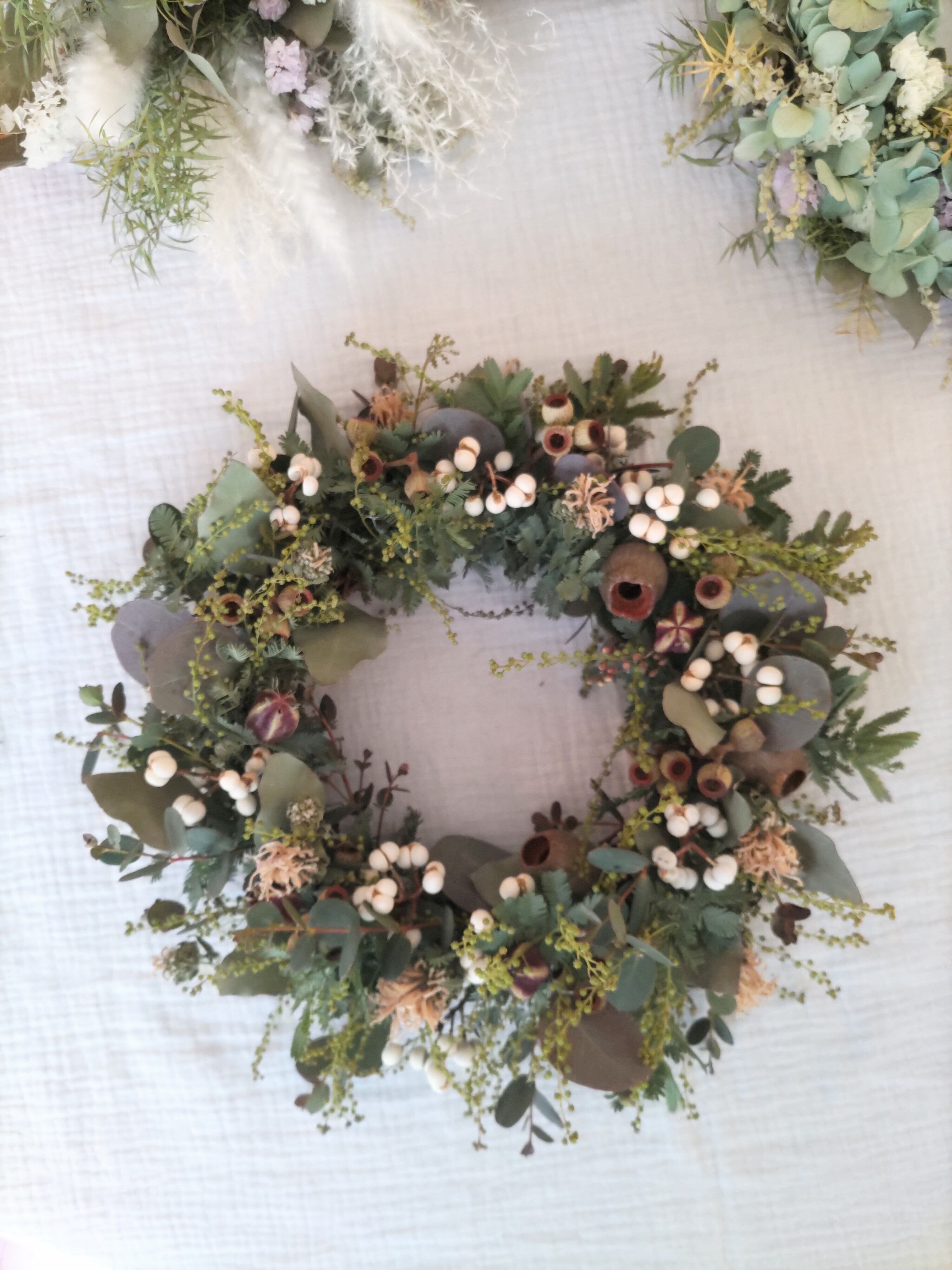 ミモザの蕾とユーカリでベースをつくり、ナンキンハゼやベルガムナッツ、モナルダを合わせたナチュラル木ノ実リースに仕上げました♡