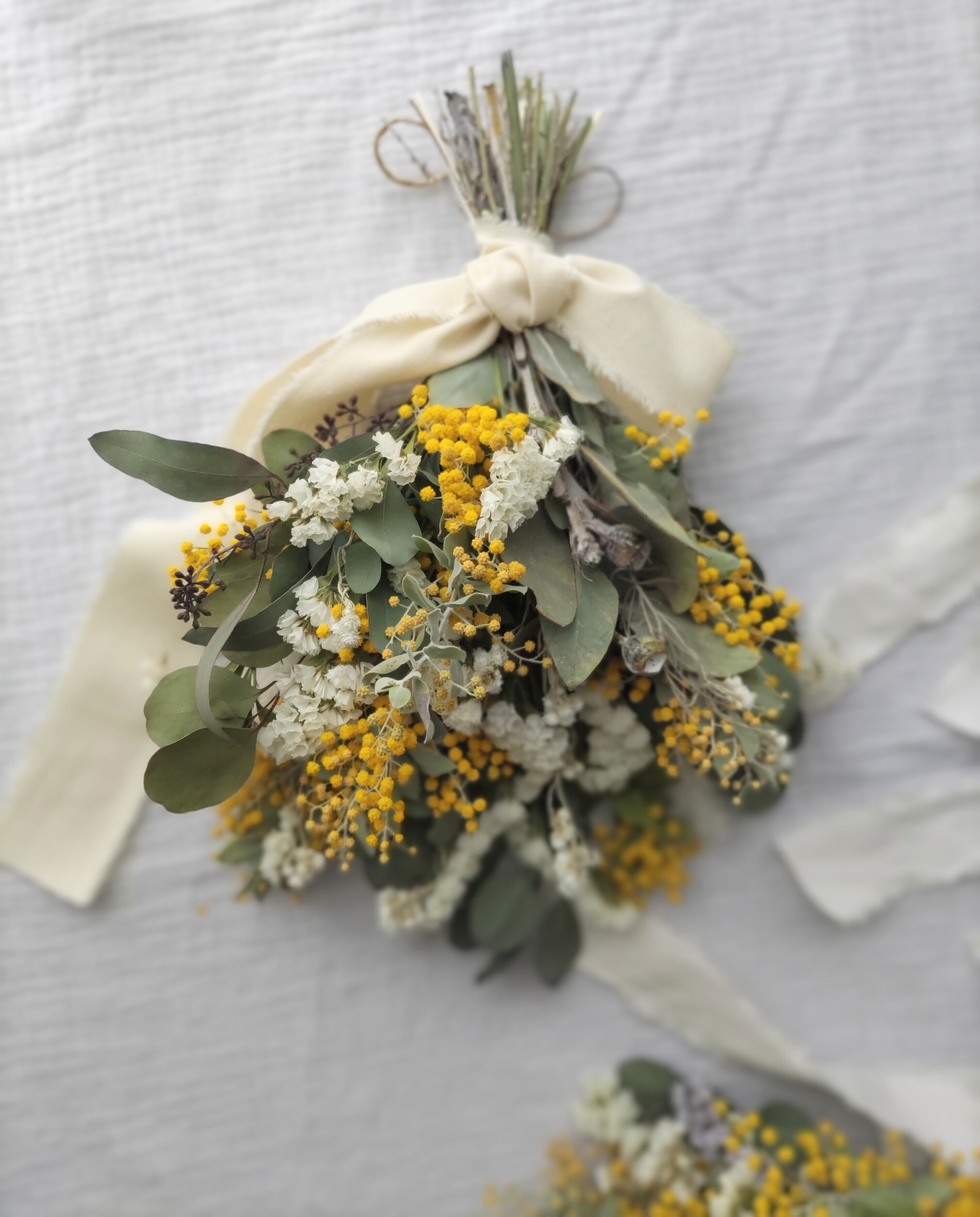 自然の恵みを閉じ込めたドライフラワーは、特別な時や思い出深い場所に飾るのも素敵。冬空の中に咲くミモザを、いつでも眺めることができます。