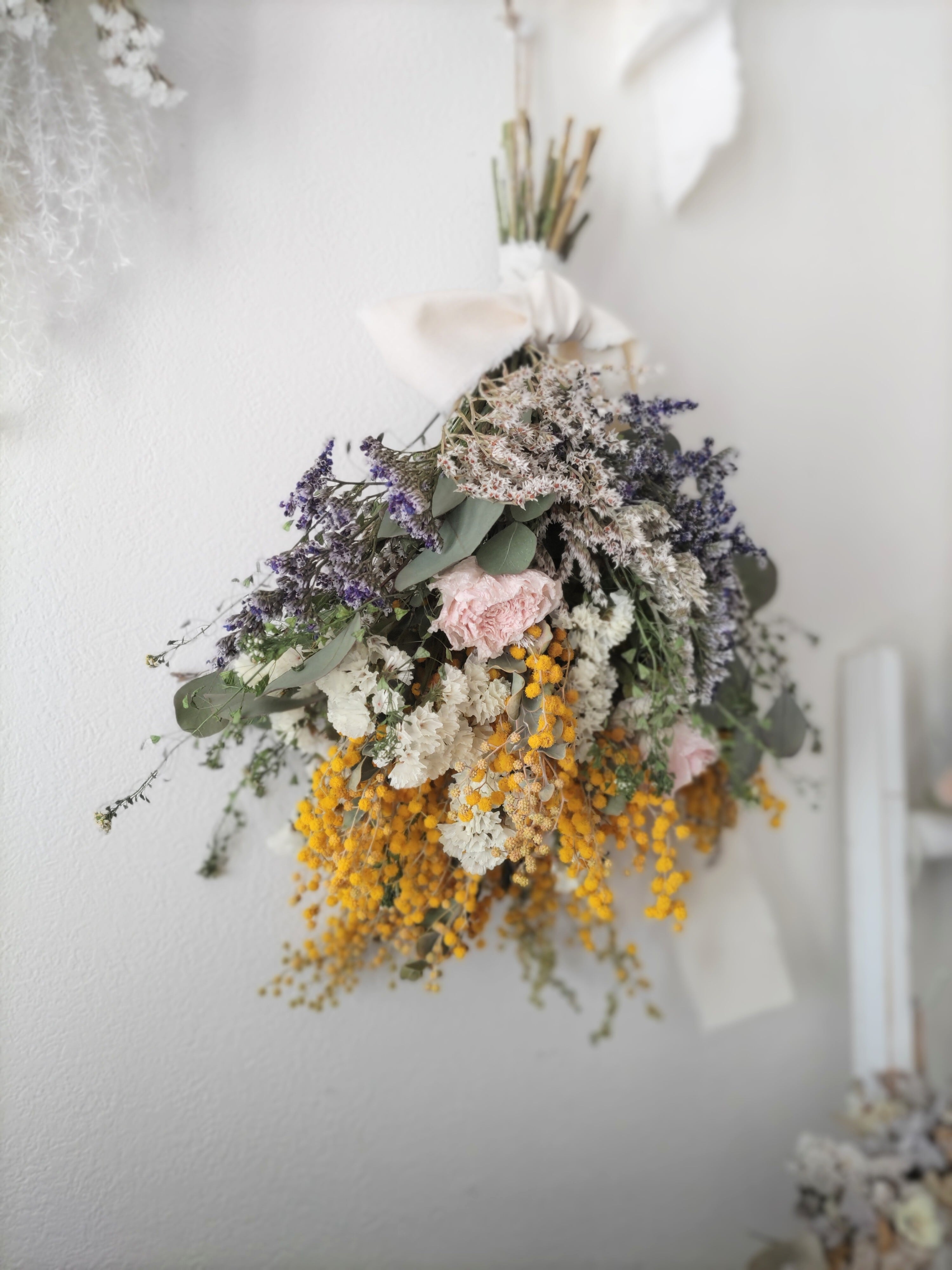 ミモザとミックスカラーのナチュラルドライフラワースワッグ