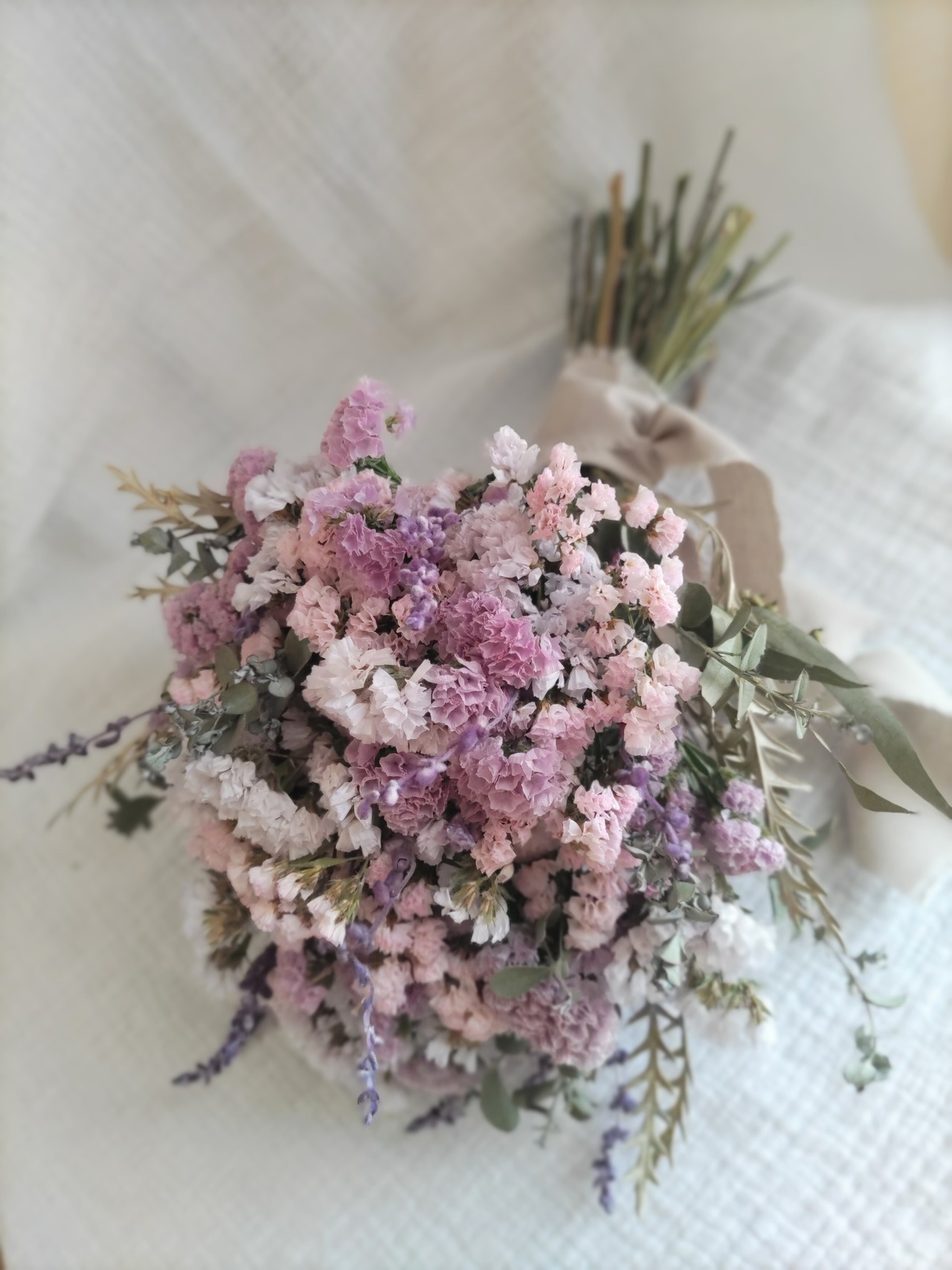 スターチスドライフラワーは、自然乾燥させて作られた花材。自然の風合いそのままに、可愛らしい存在感を放ちます。グレビレアアイバンホーとユーカリの緑が加わることで、より自然な雰囲気が演出されます。