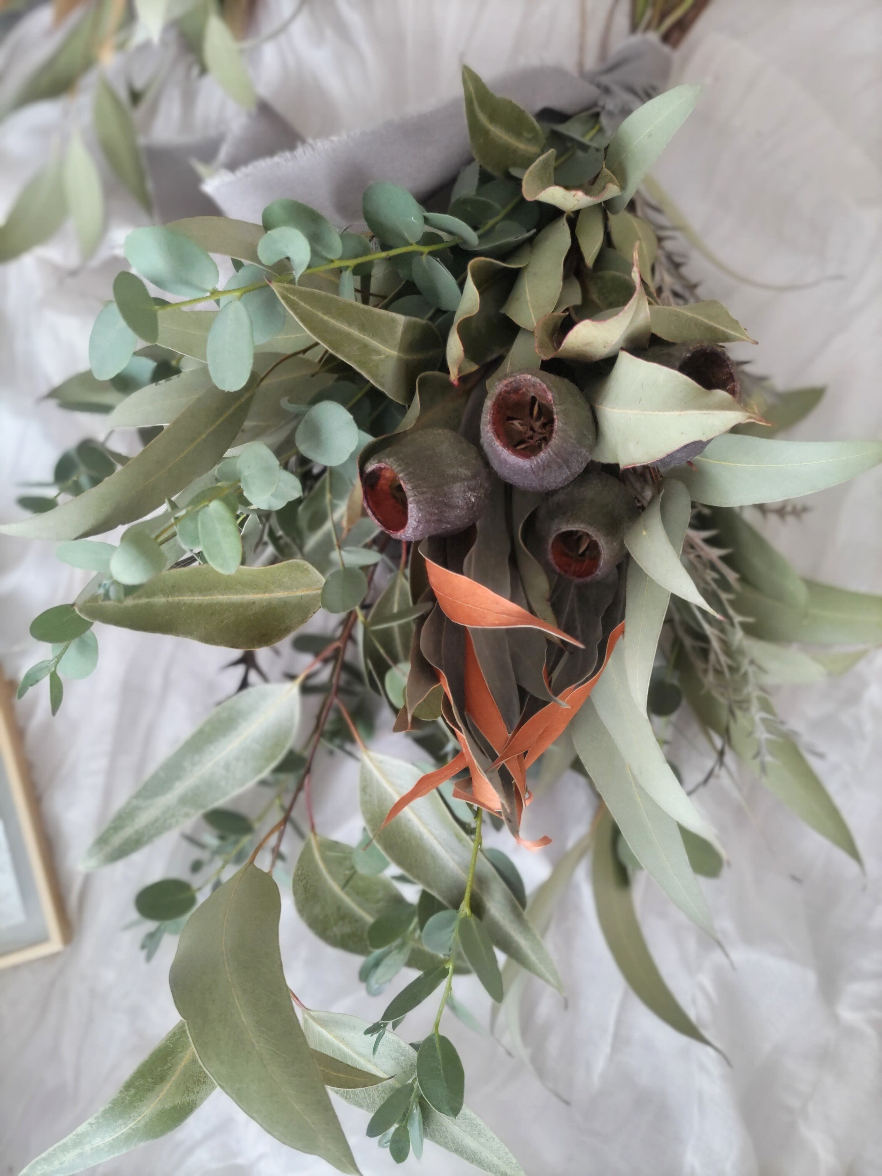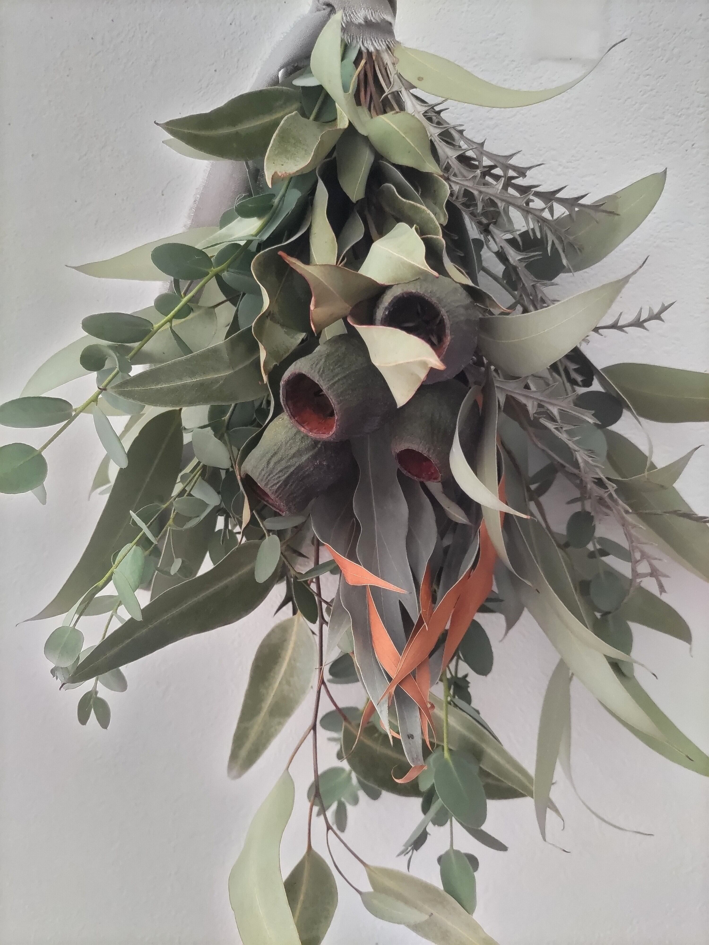 ユーカリにグレビレアゴールドやグレビレアアイバンホーを合わせたスワッグ