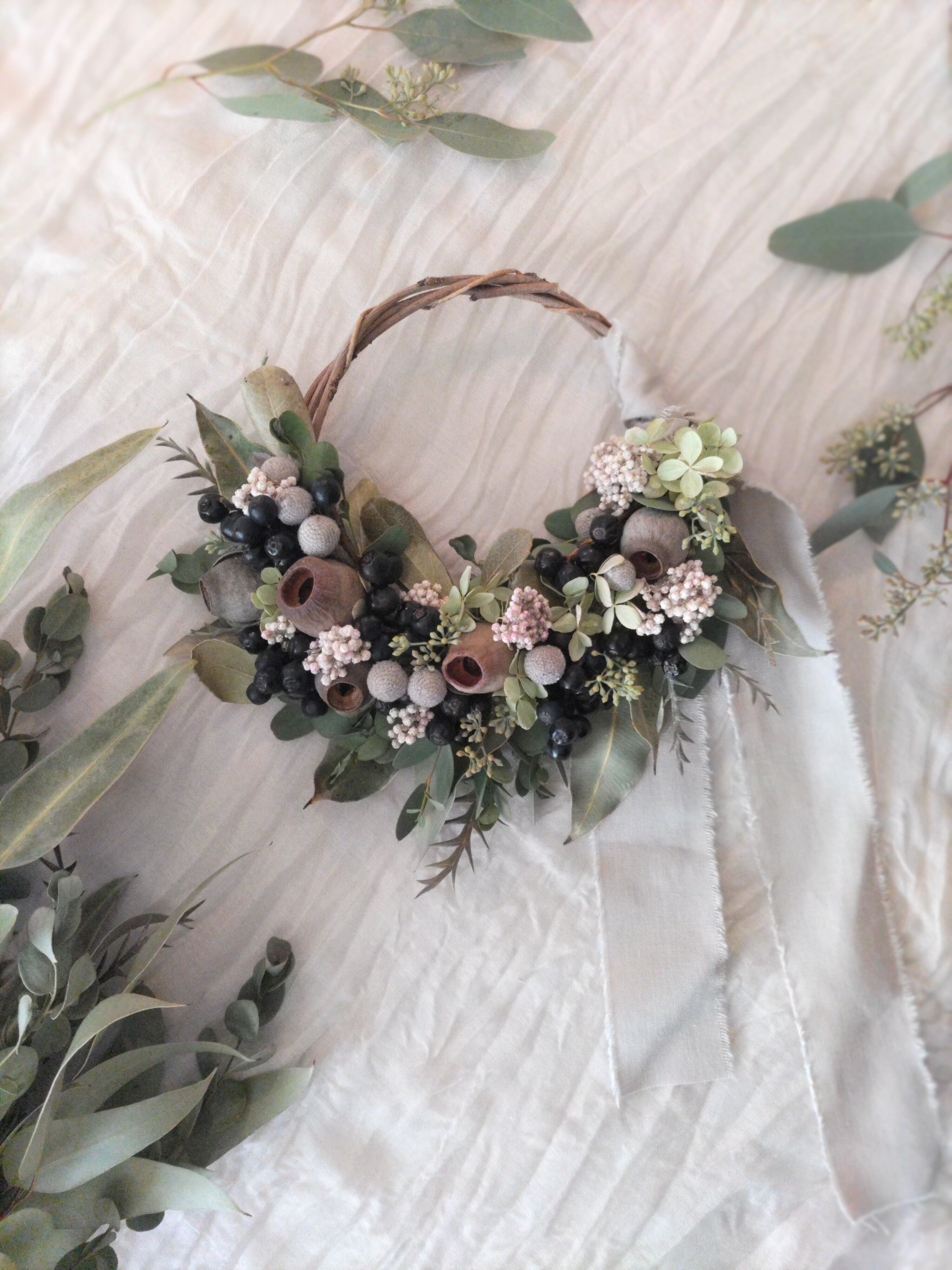 ユーカリ、シャリンバイやベルガムナッツを合わせた木の実のリース…