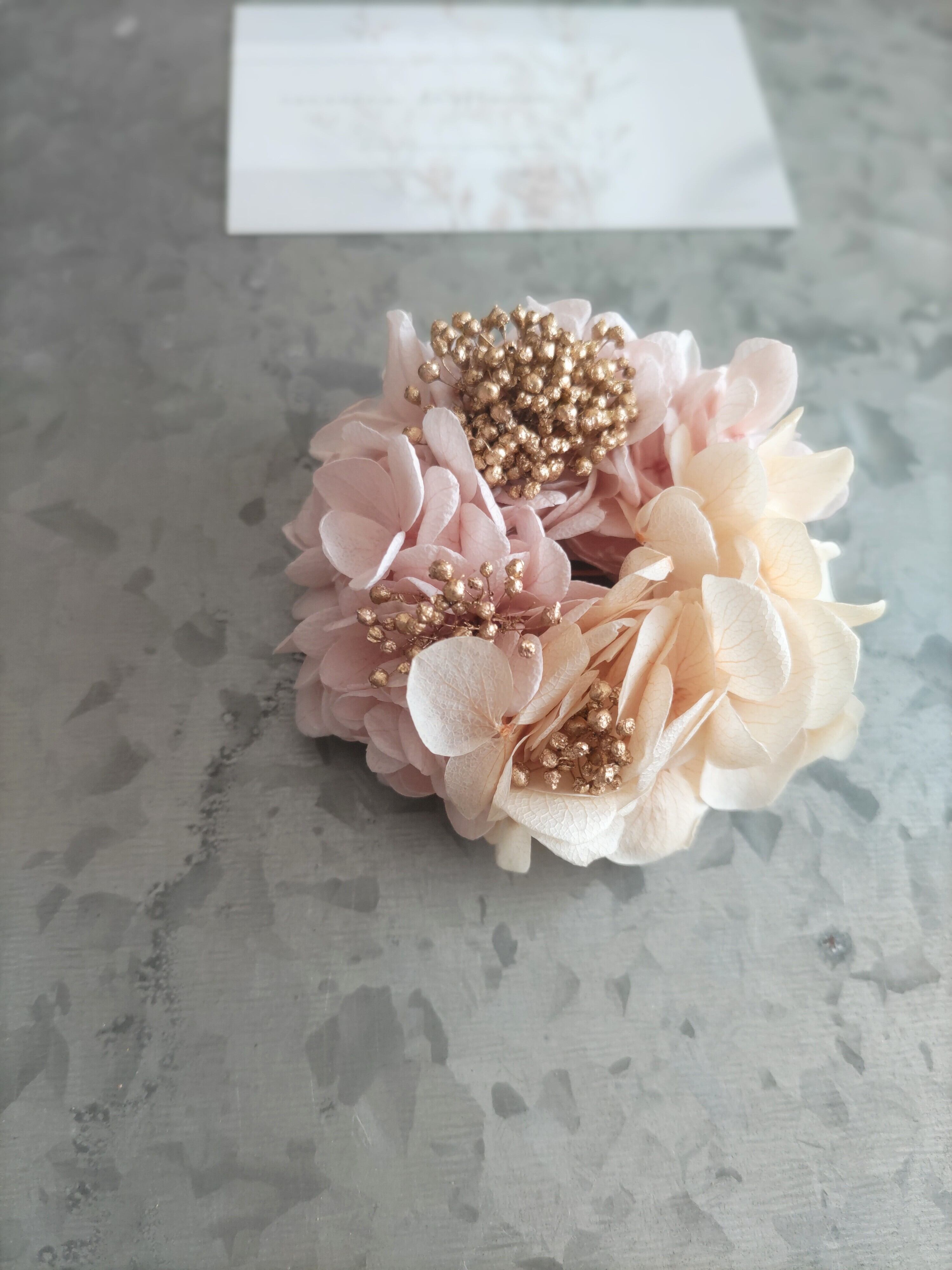 プリザーブドフラワーの紫陽花をサークルブローチに乗せて、ゴールドのかすみ草を添えたシンプルなoriginalブローチです♪