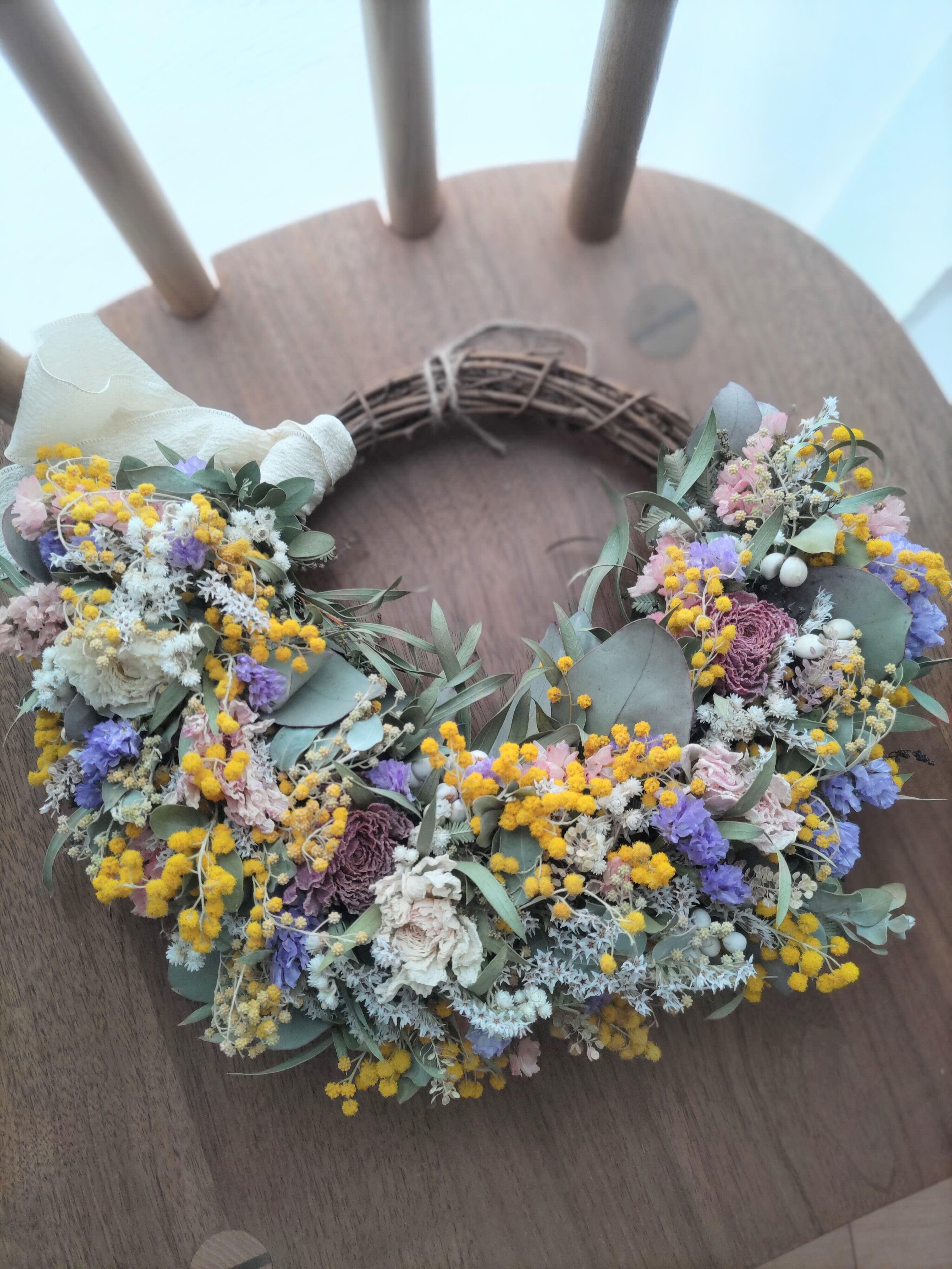 ミモザに春色のラナンキュラスやユーカリにスターチス、かすみ草も合わせた春色リース